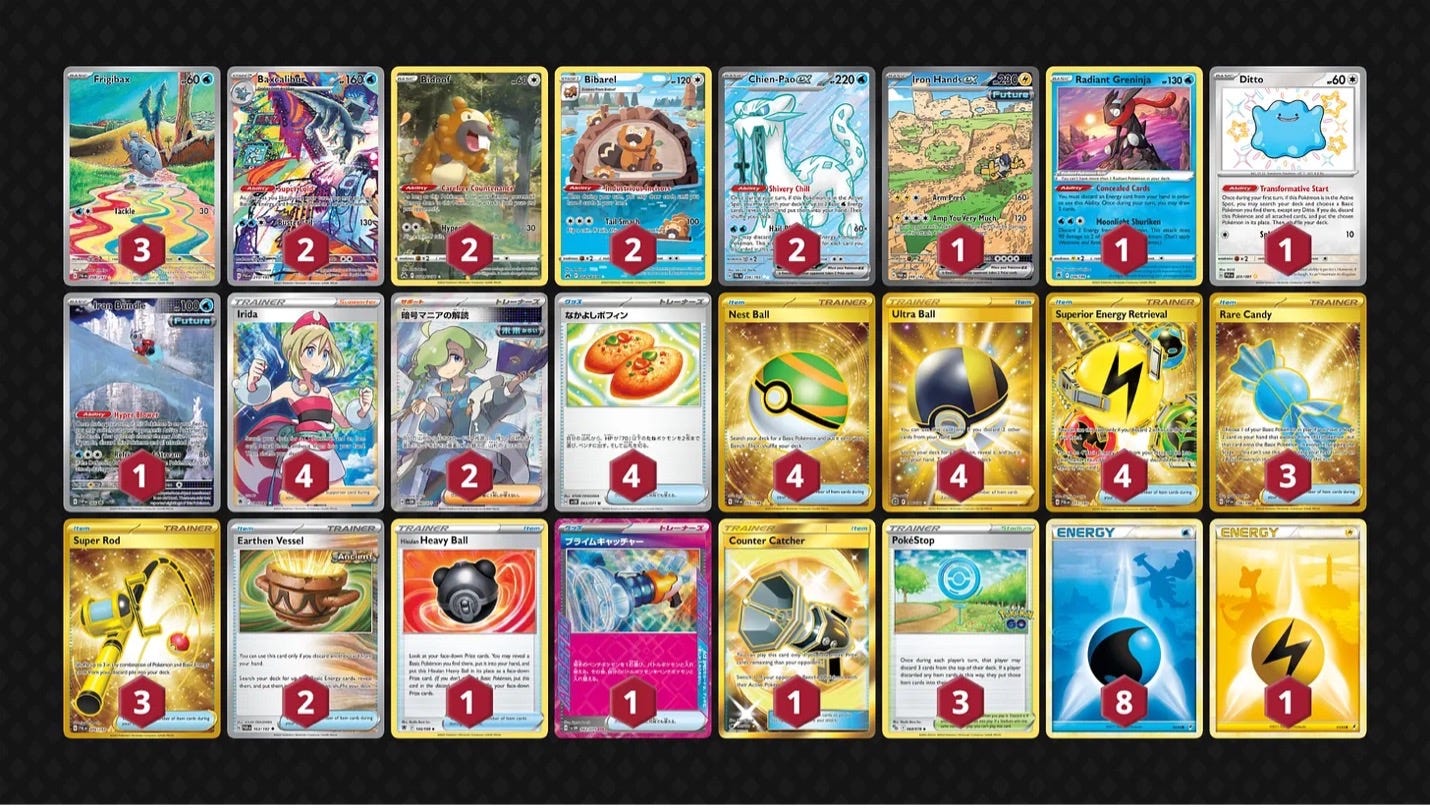 2 Pao + 3 Rod - This is one of those flips that I always whimp out of actually playing but have greater justification for sticking to in this metagame. A lot of the time, we only need 2 Pao to win the game, with Iron Hands being able to take 2 Prizes off active, and a common line for our opponent being spending a turn taking down a Baxcalibur or Bibarel to try to slow us down. While 3 Chien-Pao is powerful because it increases odds you have it when you need it, I’ve been finding myself instead preferring the extra attack with Radiant Greninja and/or Iron Hands to take additional Prize cards. For Iron Hands, oftentimes we’re dealing with a low-HP board and want multiple Iron Hands, and For Greninja’s case we can play the 1-Prize game, keeping 2 Prizers off our board completely while spreading with Greninja to win the Prize race. This is a small but impactful change in my opinion that might give the extra edge in some matchups where you need to discard rods early and/or they’re stuck in the Prizes.